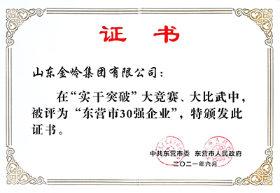 2021年6月27日,在東營(yíng)市市委、市政府舉辦的“實(shí)干突破”大競(jìng)賽、大比武活動(dòng)中,山東金嶺集團(tuán)有限公司被評(píng)為“東營(yíng)市30強(qiáng)企業(yè)”。以表彰公司踐行新的發(fā)展理念,不斷提高創(chuàng)新能力、優(yōu)化產(chǎn)品結(jié)構(gòu)、深入發(fā)展循環(huán)經(jīng)濟(jì)、履行社會(huì)責(zé)任等方面做出的積極貢獻(xiàn)。