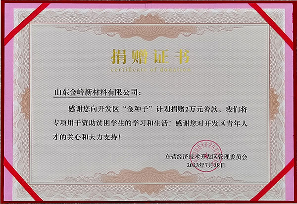 2023年7月28日,東營(yíng)青年人才“背包E?!眴?dòng)儀式暨悅來(lái)湖人才街區(qū)開街活動(dòng)在開發(fā)區(qū)悅來(lái)湖人才街區(qū)舉行,山東金嶺新材料有限公司作為“金種子”贊助單位為活動(dòng)贊助資金兩萬(wàn)元,東營(yíng)經(jīng)濟(jì)技術(shù)開發(fā)區(qū)黨工委書記、管委會(huì)主任康茂禮為公司頒發(fā)榮譽(yù)證書,并對(duì)公司在開發(fā)區(qū)人力資源和社會(huì)保障方面做出的貢獻(xiàn)給予充分肯定。
