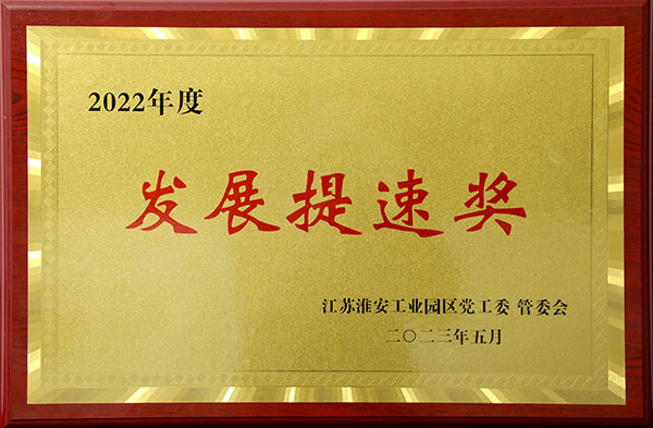 2023年5月10日,在淮安工業(yè)園區(qū)管委會(huì)舉辦的高質(zhì)量發(fā)展總結(jié)動(dòng)員大會(huì)暨“沖刺雙過半”經(jīng)濟(jì)運(yùn)行調(diào)度會(huì)上,江蘇富強(qiáng)新材料有限公司被授予“2022年度發(fā)展提速獎(jiǎng)”,以表彰公司對(duì)當(dāng)?shù)亟?jīng)濟(jì)發(fā)展做出的突出貢獻(xiàn)。