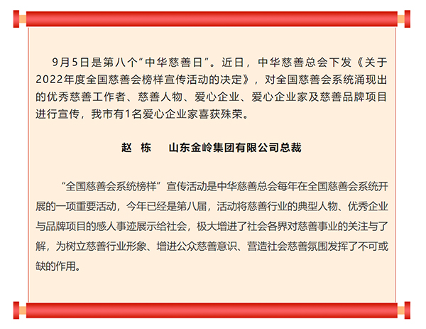 2023年9月5日是第八個(gè)“全國(guó)慈善會(huì)系統(tǒng)榜樣”宣傳活動(dòng)暨第八個(gè)“中華慈善日”,中華慈善總會(huì)下發(fā)《關(guān)于2022年度全國(guó)慈善會(huì)榜樣宣傳活動(dòng)的決定》,對(duì)全國(guó)慈善會(huì)系統(tǒng)涌現(xiàn)出的優(yōu)秀慈善工作者、慈善人物、愛(ài)心企業(yè)、愛(ài)心企業(yè)家及慈善品牌項(xiàng)目進(jìn)行宣傳,金嶺集團(tuán)總裁趙棟喜獲“全國(guó)慈善會(huì)系統(tǒng)榜樣”稱號(hào)。