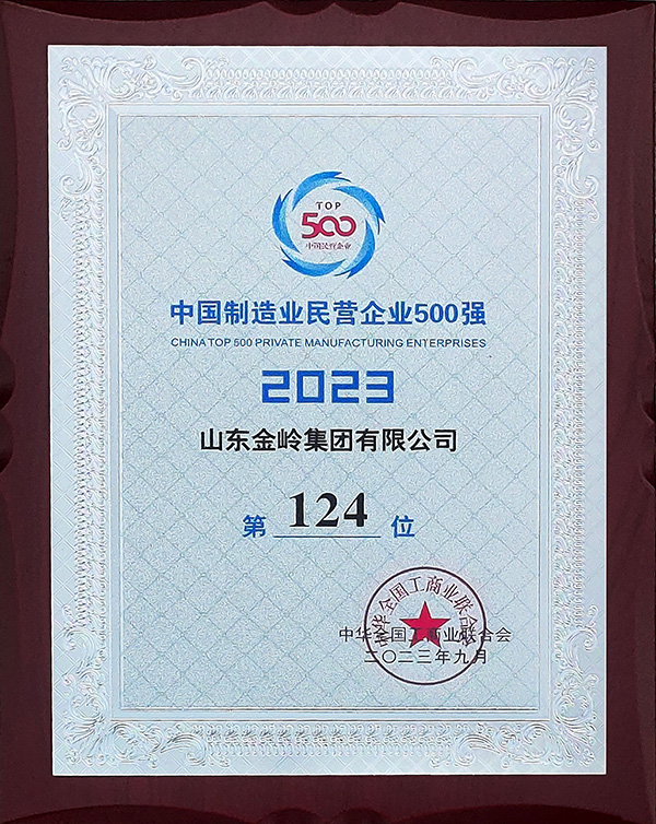2023年9月,全國(guó)工商業(yè)聯(lián)合會(huì)發(fā)布中國(guó)民營(yíng)企業(yè)500強(qiáng)、中國(guó)制造業(yè)民營(yíng)企業(yè)500強(qiáng)榜單,金嶺集團(tuán)位列“2023中國(guó)民營(yíng)企業(yè)500強(qiáng)”第184位,“2023中國(guó)制造業(yè)民營(yíng)企業(yè)500強(qiáng)”第124位。