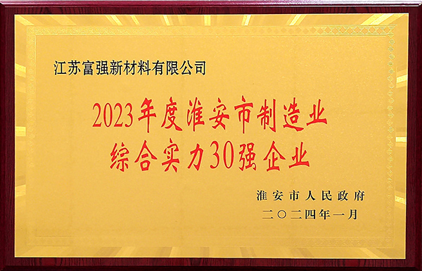 2024年2月18日,在淮安市委市政府召開的全市重特大項(xiàng)目攻堅(jiān)暨優(yōu)化營商環(huán)境大會(huì)上,江蘇富強(qiáng)新材料有限公司被評為“2023年度淮安市制造業(yè)綜合實(shí)力30強(qiáng)企業(yè)”。