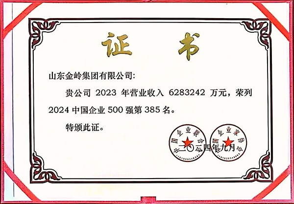 2024年9月,中國企業(yè)聯(lián)合會、中國企業(yè)家協(xié)會發(fā)布2024中國企業(yè)500強、2024中國制造業(yè)企業(yè)500強榜單,金嶺集團位列“2024中國企業(yè)500強”第385位;“2024中國制造業(yè)企業(yè)500強”第197位;公司已連續(xù)多年入圍中國企業(yè)500強、中國制造業(yè)企業(yè)500強。