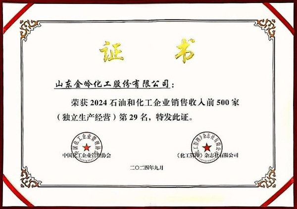 金嶺集團(tuán)入圍“中國(guó)石油和化工企業(yè)銷售收入前500家”“專用化學(xué)產(chǎn)品企業(yè)銷售收入前100家”“石油和化工企業(yè)銷售收入前500家”