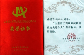 近日,集團公司董事長趙曰嶺被山東省工商聯(lián)合會授予“山東省工商聯(lián)系統(tǒng)抗震救災先進個人”榮譽稱號。