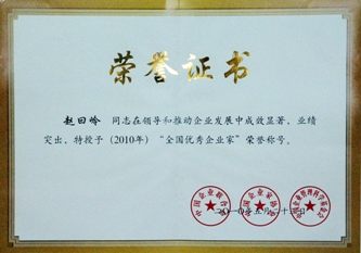 5月23日至24日,2010年全國企業(yè)家活動(dòng)日暨中國企業(yè)家年會(huì)在湖南長沙舉行,會(huì)議揭曉我國企業(yè)界最高獎(jiǎng)項(xiàng)——“全國優(yōu)秀企業(yè)家”獎(jiǎng)并舉行表彰儀式,公司董事長趙曰嶺榮獲“全國優(yōu)秀企業(yè)家”稱號(hào)?! ?/DIV>